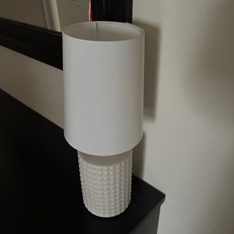 IKEA ISKÄRNA bordslampa i form av ett huvud. Lampan är vit och ändrar färg. Passar som dekorativ belysning i sovrum, vardagsrum eller barnrum.