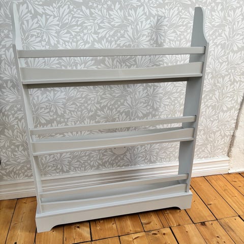 Gedigen vit hylla i massivt trä med tre hyllplan. Passar perfekt som tallrikshylla i köket eller som bokhylla eller barnhylla i barnrummet för böcker och småsaker.