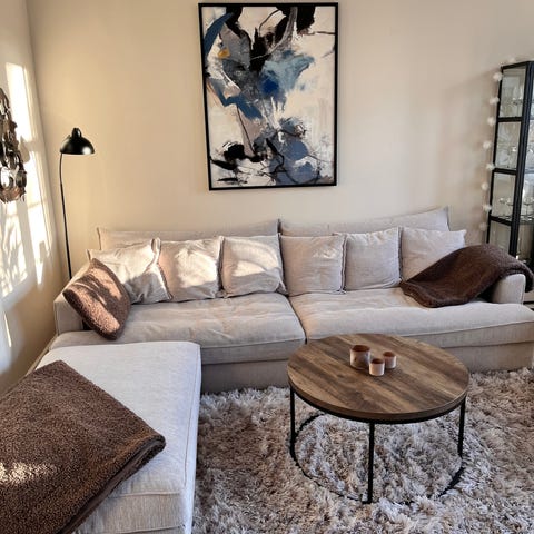 Sälja vår senapsgula Söderhamnsoffa. Det är en tresittsoffa plus schäslong och klädseln går att ta av och tvätta!