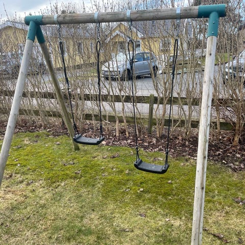 Gungställning som är okänt antal år gammal. Vi tog över den 2023, då målade vi om den och bytte ut vissa delar - skruvar / muttrar.