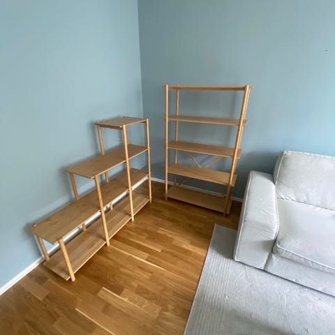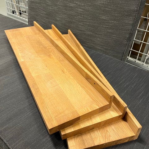 Den ena har vi borrat ett hål i för att hyllan skulle vara framför ett eluttag. Ska du använda hyllan utan eluttag bakom syns inte hålet.