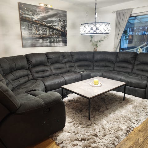 Skön biosoffa som du kan sätta ihop efter dina önskemål. Tre av delarna har recliner och du kan sitta gudomligt skönt när du tittar på film. Hög i ryggen vilket ger skönt stöd för huvud och nacke. Säljes då vi har behov av en bäddsoffa.