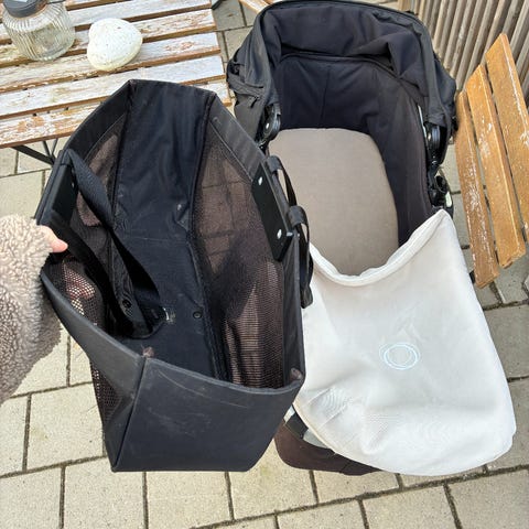 I transportväskan från Bugaboo finns det separata fack för swivelhjulen, utrymme för parasoll och några extra fack där du kan lägga andra saker.