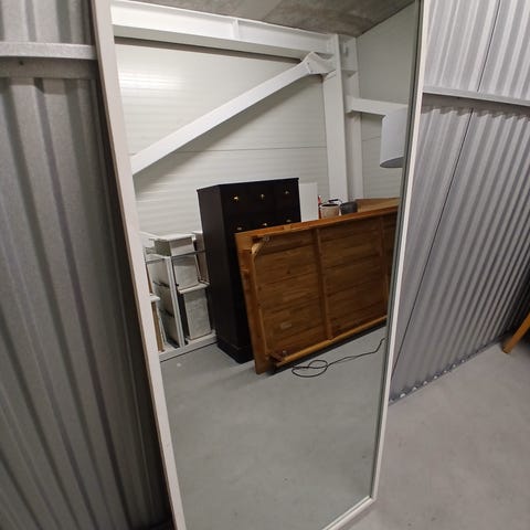 Jysk spegel med dekorativ ram i ljus färg. Spegeln har en rektangulär form och en profilerad, ornamenterad ram som ger ett klassiskt uttryck. Passar exempelvis i hall, sovrum eller vardagsrum som helkroppsspegel eller som större väggspegel.