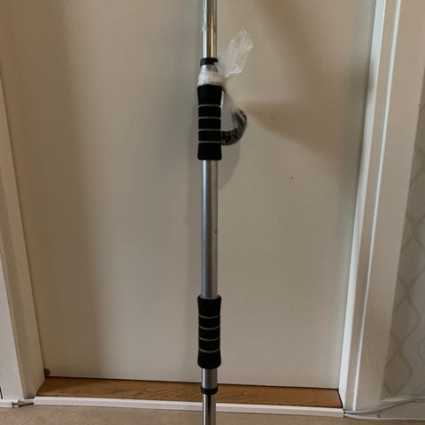 Dörrtrapets i silverfärgad metall med svarta skumhandtag. Produkten är avsedd för montering i dörrkarm för olika typer av överkroppsträning, till exempel pull-ups och chin-ups. Medföljande fästen ingår för montering i dörröppning. Passar för hemmaträning där en enkel lösning för kroppsviktsövningar önskas.
