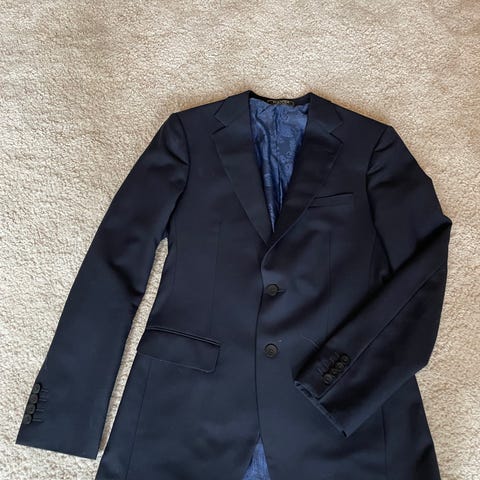 Svart kostym med tre knappar framtill. Jackan har en bröstficka och två fickor framtill. Byxorna har två fickor framtill och två fickor baktill. byxor ( från till midjan till fot kanten 90 CM ) använd 3 gånger bara!!!