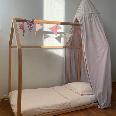 Ramen är köpt begagnat men har målats om av oss. De förra ägarna hade satt reglar upptill för att bilda som ett tak där man kan hänga små lampor eller tyg!