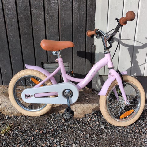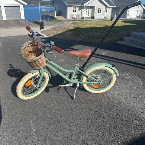 Barncykel med 16" hjul i grön färg. Cykeln har lågt insteg, kedjeskydd, skärmar och fotbroms. Utrustad med brun sadel och handtag samt flätad framkorg. Passar barn som behöver en cykel med 16-tums hjulstorlek för vardagscykling och kortare turer.