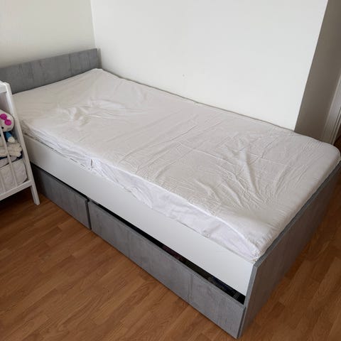 IKEA säng med förvaring i vit färg inkl madrass. Sängen har utdragslådor under liggytan som ger extra förvaringsutrymme. Sänggaveln är hög och består av horisontella paneler. På sidan av gaveln finns en liten hylla som kan användas som nattduksbord för mindre föremål som lampa, bok eller glasögon. Passar som enkelsäng i sovrum, gästrum eller tonårsrum.