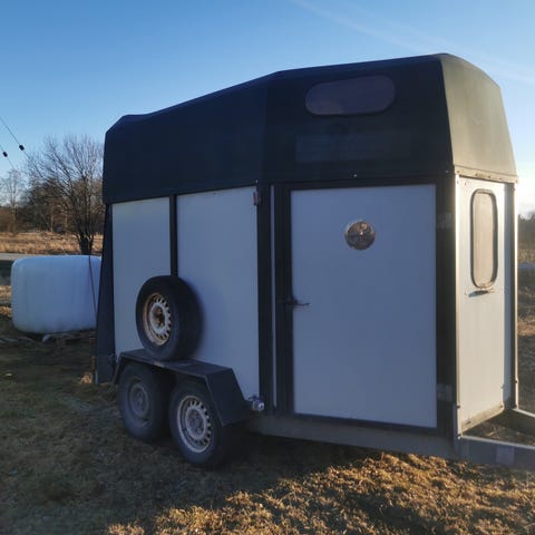 Hästtransport släp med två axlar och kåpa. Utrustad med innerdörr/avdelare och bommar invändigt. Passar för transport av häst eller mindre djur samt som täckt lastsläp. Fälgar med däck monterade, inklusive reservhjul på sidan. Invändigt trägolv och väggar med skyddande beklädnad.