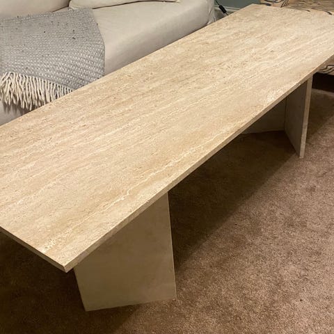 Säljer ett hemma gjort soffbord som består av en 120x60cm klinker platta Flodsten Artic och två st eket hyllor i valnöt från ikea som ben.