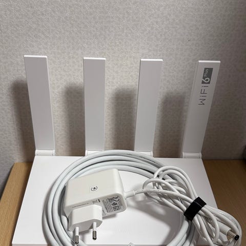 Huawei AX6 router med stöd för WiFi 6. Routern har fyra externa antenner och är avsedd för trådlösa hemnätverk. Enheten kopplas till befintligt bredband och fördelar internetanslutning trådlöst till datorer, mobiler, surfplattor och andra nätverksanslutna enheter. Färg: svart.
