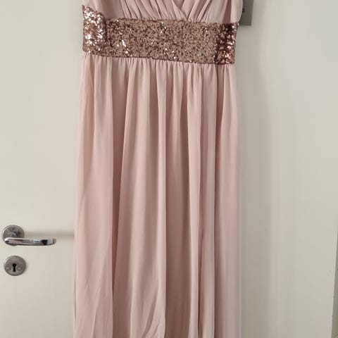 Vacker skir rosa lång klänning. Lite längre bak. Löstagbar överdel i brodyr/spets. Överdelen kan användas separat eller till klänningen.