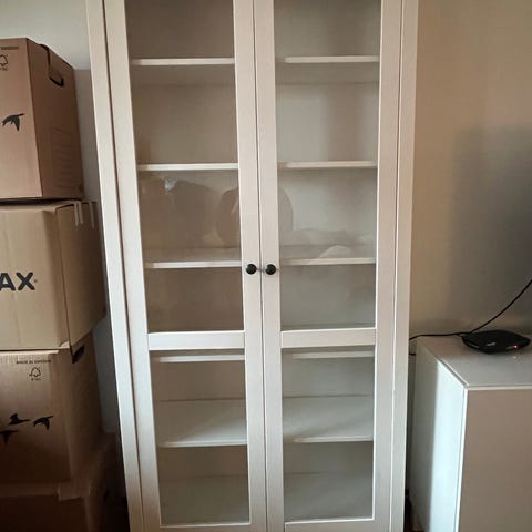 Säljer en Billy bokhylla från IKEA med vitrindörrar (Oxberg). Själva bokhyllan har några år på nacken och är vitmålad. Vitrindörrarna är dock nya och skåpet ger ett fint helhetsintryck!