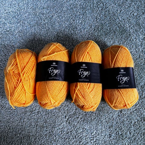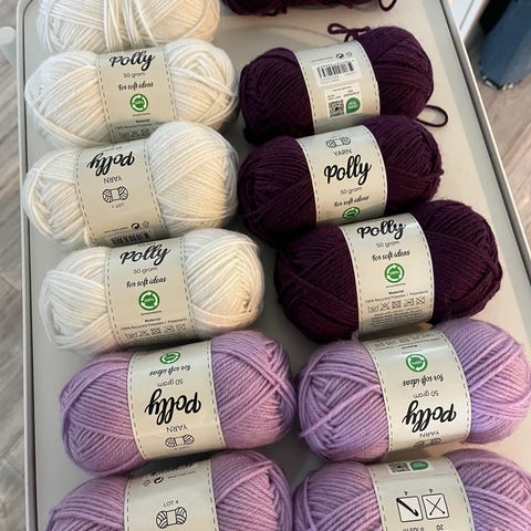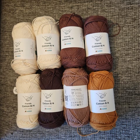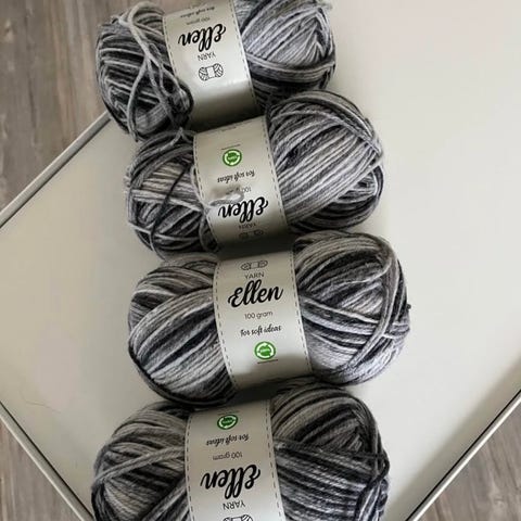 Ester garn i flera färger. Nystan i vit, rosa och blå ton, troligen i bomull eller bomullsblandning enligt banderollens märkning. Passar för stickning och virkning av exempelvis plagg, accessoarer och hemtextilier. Garnet levereras i nystan med etikett kvar, med information om material, tvättråd och rekommenderad stickstorlek på banderollen.