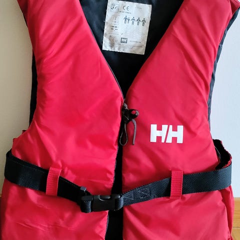 Helly Hansen flytväst, en i storlek XS och en i storlek S. Flytvästarna är anpassade till 40-50kg respektive 50-60kg. Klämma och snöre finns på framsidan för att spänna fast sig.