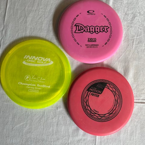 Blandat set discgolfdiscar från flera märken och modeller. I uppsättningen syns bland annat Discraft Zone putter/midrange, Clash Discs Honey distance driver, Momentum Disc Golf Slim putt & approach samt Curd Short Slacker distance driver. Discarna är i olika färger, bland annat gul, röd, blå, grön, vit och rosa. Passar för discgolfspelare som vill ha flera olika typer av kast, till exempel putt, approach och längre drives. Alla discar är i plast och avsedda för utomhusspel på discgolfbana.