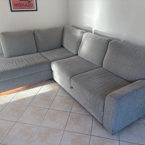 Grå L-Formad hörnsoffa - bra skick. En bekväm soffa som har en modern och minimalistisk design som passar bra i de flesta hem. Dess design gör det bra för mysiga hemmakvällar och när man har gäster eller familjemedlemmar över.