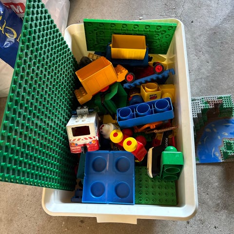 Låda med blandat duplo, några bilar, tåg och figurer samt en stor grön byggplatta
