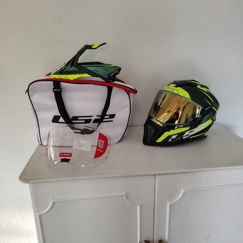 Hjälmen har klart visir, nedfällbart solskydd samt ventilationsöppningar framtill och upptill.