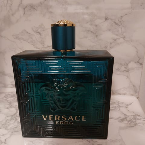 Versace Eros parfym för herr. Doften kommer i en turkosblå glasflaska med guld- och blått lock samt präglad Medusa-logotyp på framsidan. Passar som vardags- och kvällsdoft.