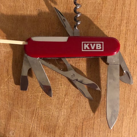 schweizisk armékniv multifunktionskniv i röd färg. Fällkniven har flera olika verktyg integrerade, bland annat knivblad, sax, såg, tång, fil och andra småverktyg. Handtaget är i röd plast. Hör av dig vid frågor