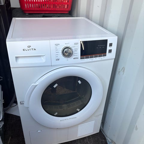 Cylinda kondenstorktumlare i vitt utförande. Frontmatad modell med rund lucka och trumma i rostfritt stål. Panel med vred och knappar för val av program och inställningar. Avsedd för torkning av vardagstextilier i hemmet, exempelvis kläder, handdukar och sängkläder.