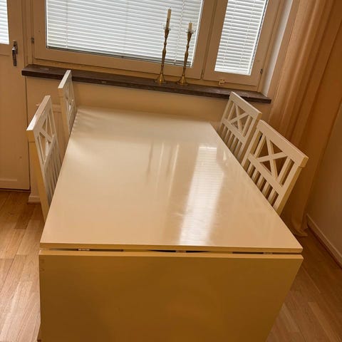 Hämtas i Nyby, en våning upp (hiss finns). Jag kan skruva av bordsbenen för att förenkla transport, men du får ta med egen bärhjälp vid behov.