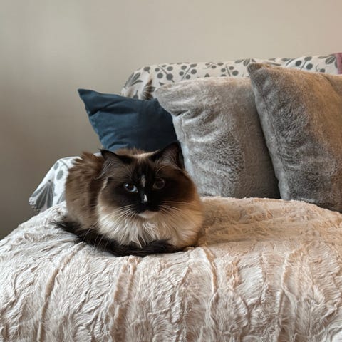 Hon är pigg och busig, och gör allt till en lek bollar och snören är extra roliga! Hon följer gärna efter dig i hemmet för att se vad du gör, och hennes personlighet påminner lite om en hund. Hon är van vid barn, då flera barn från grannskapet har lekt med henne, och hon har även kommit nära hunden i sin familj.