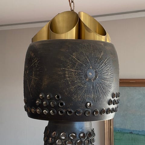 Säljer en 5-armad taklampa i mässing med tillhörande glaskupor i strukturglas. Klassisk retrodesign från 1960–70-tal med dekorativ mittdel och tidstypiska glas.