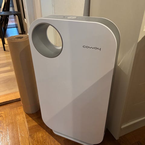 Coway AP-1008CH luftrenare i vit färg. Modellen har ett vertikalt, fristående utförande med luftintag på baksidan och rund öppning upptill på fronten. På ovansidan finns kontrollpanel med lägen för auto, manuell hastighetsreglering, tystläge och olika driftslägen. Lämplig för inomhusbruk i bostad eller kontor för filtrering av inomhusluft.