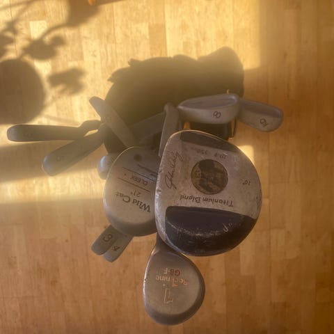 Här har vi diverse golfklubbor för en billig peng som passar perfekt för en nybörjare. Klubborna sträcker sig från p-i3 samt en träklubba och en putter. Dock saknas greppet på järn 6:an.