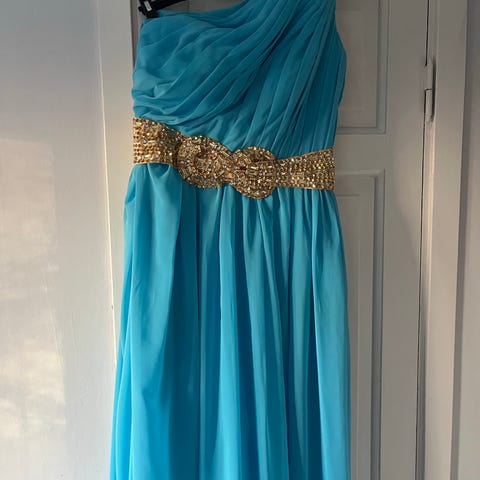 H&M party-/cocktailklänning för dam i storlek 38. Klänningen är lila och tillverkad i chiffong med ett lätt och följsamt fall. Livet har dekorativt mönster med guldfärgade detaljer framtill samt tunna axelband. Passar för fest- och högtidsanvändning.