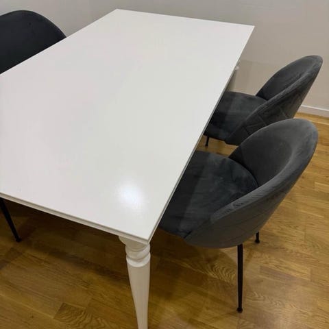 Klassiskt vitt matbord från Ikea som passar bra in i små kök. En extra skiva förvaras under bordet och monteras enkelt på plats för att få två extra sittplatser längst långsidan av bordet.