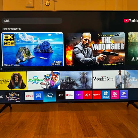 Samsung QE55Q8T TV. QLED-skärm på 55 tum med 4K-upplösning. Smart-TV-funktioner med appar och streamingtjänster via internet. Flera HDMI- och USB-ingångar för anslutning av externa enheter. Medföljande fjärrkontroll enligt bild. Lämplig som huvud-TV i vardagsrum eller större rum.
