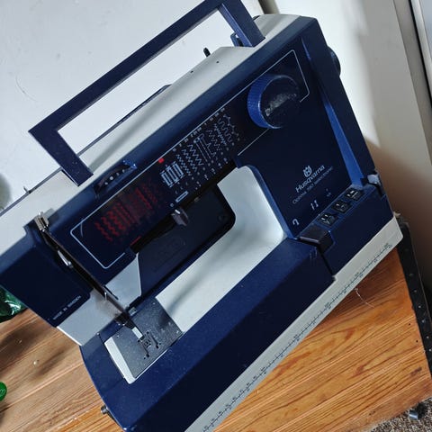 Hugin Victoria symaskin i vit och blå färg. Maskinen har flera olika sömmar markerade på fronten, inklusive raksöm, sicksack och dekorativa sömmar. Reglage på ovansidan används för att ställa in sömtyp, stygnlängd och eventuellt bredd. På framsidan finns strömbrytare och anslutning för fotpedal. Passar för grundläggande sömnadsarbeten som uppläggning, lagning och enklare sömnadsprojekt i hemmet.