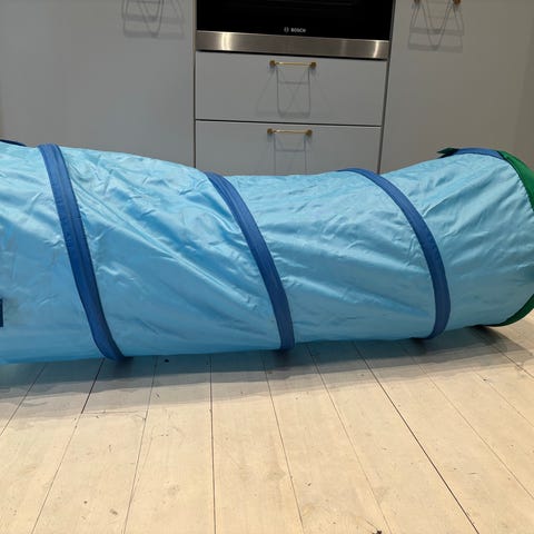 Tältet kan fyllas med bollar eller användas som krypin, och tunneln passar för kryp- och rörelselek inomhus. Tillverkad i lätt textilmaterial med böjliga stag som gör delarna enkla att fälla ihop och förvara när de inte används.