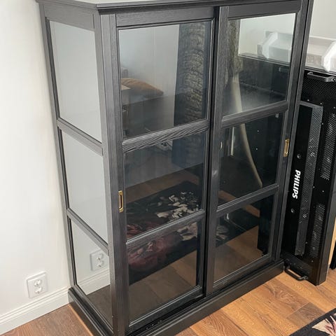 Vitrinskåp Malsjö från IKEA i svart, utgått ur sortimentet. Mått och vikt enligt bild. Finns små tecken på användning, en liten repa på ovansidan (se bild) men inget som stör. Ingår belysning. Tungt så bärhjälp krävs. Kommer från rök & djurfritt hem, finns att hämta i Katrineholm.