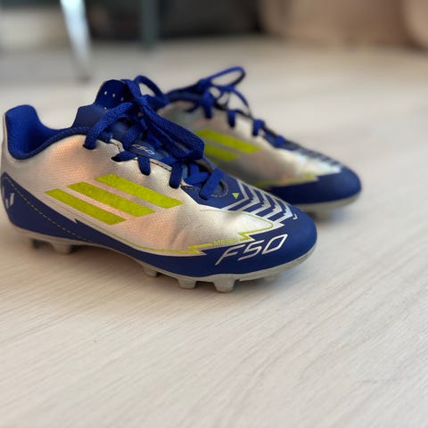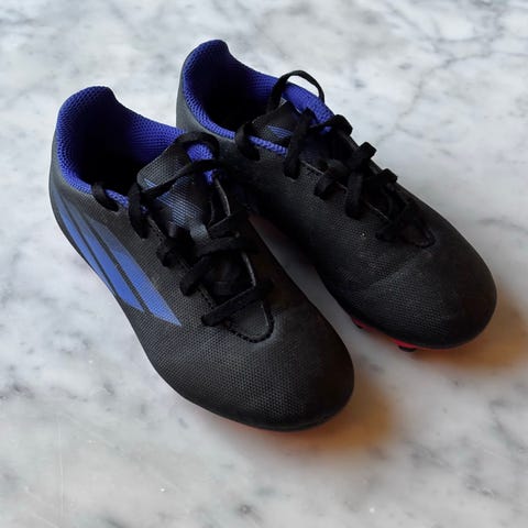 Adidas Predator Freak 4 fotbollsskor för junior. Skorna är i blått och svart med vita ränder och har en neonfärgad sula med dobbar anpassade för spel på konstgräs eller naturgräs. Storlek EU 31 (UK 12,5 / US 13K). Ovandel i syntetmaterial med snörning för justerbar passform. Modellkod FY0632.