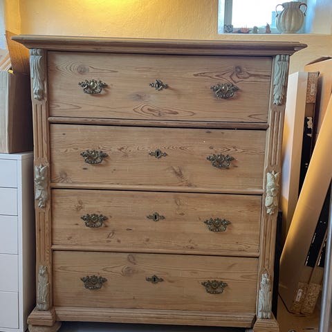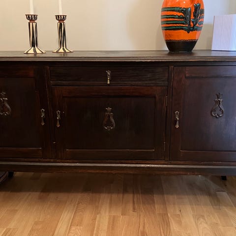 Vi måste tyvärr sälja min farmor och farfars fina rymliga Sidebord i mahogny från 1914 pga flytt till mindre bostad. Det ena skåpet rymmer en hel servis för 12 pers. med 4 storlekar tallrikar. De andra skåpet rymmer både kaffe- och teservis med fat. I mittenskåpet finns det plats för uppläggsfat och bestick.