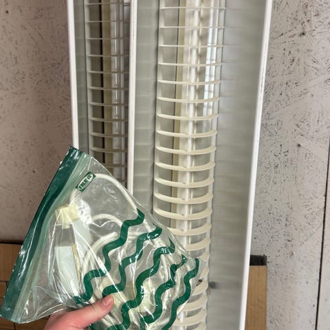 Glasarmatur med skyddsgaller i metall. Armaturen har ett avlångt, välvt glas med utanpåliggande metallgaller som skyddar glaset. Monteringsfästen sitter på ovansidan för fastsättning mot vägg eller tak. Passar exempelvis som belysningsarmatur i förråd, garage eller andra utrymmen där extra skydd runt glaset önskas. Mått framgår delvis av måttstock på bild, ungefärlig längd runt 25x15 cm.