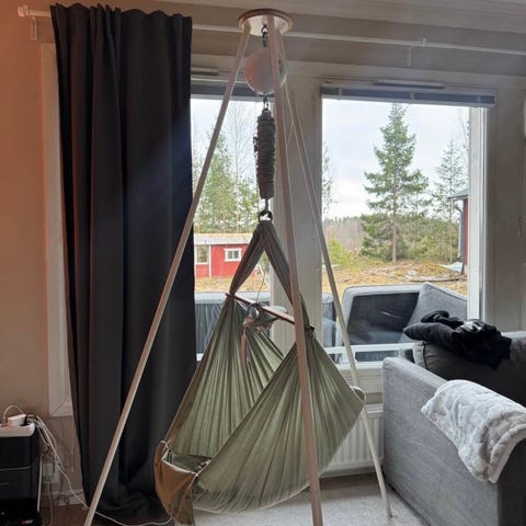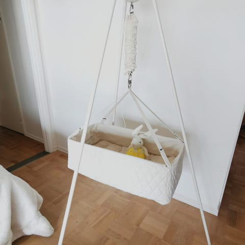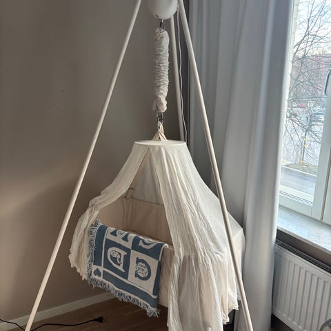 Vaggan är sparsamt använd och i mycket fint skick. Stativet gör att du enkelt kan placera den var som helst i hemmet – ingen montering i tak behövs.