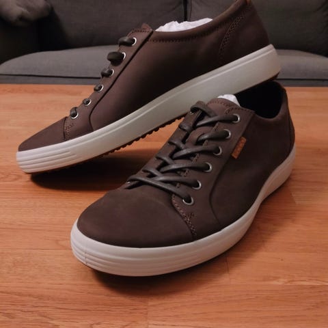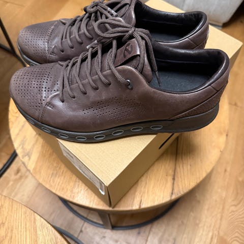 Ecco sneakers i storlek 43. Modellen är i brunt läder med snörning och kontrasterande ljus sula. Ovandelen kombinerar slätt läder med perforerade detaljer på sidorna och textilparti vid häl för bättre ventilation. Yttersulan är mönstrad för grepp vid gång. Passar som vardagssko eller för lättare promenader. Har bara används ett fåtal gånger. Nypris 1 600kr. Finns för avhämtning i umeå.