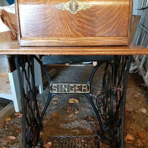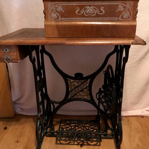 Symaskin från Husqvarna. Maskinen är monterad i ett träbord med tillhörande lock. Underredet är i svart smide med texten "HUSQVARNA" ingraverad. Symaskinen är svart med guldfärgade detaljer och mönster.