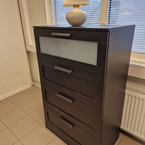Byrå MALM med 6 lådor och glasskiva. Färgen är svart-brun.