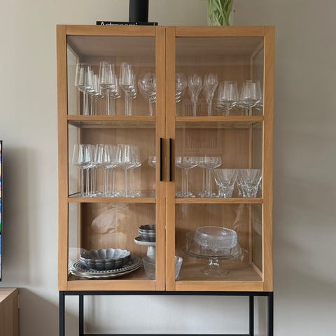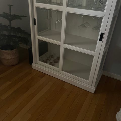 Vitt vitrinskåp, bra med förvaring! Trälådor sitter med metallskena ej plast = hållbart.