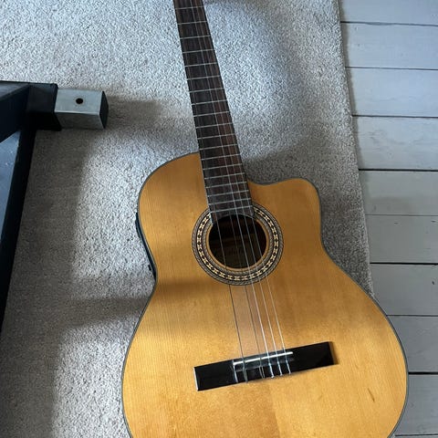 Säljer min dotters gitarr som hon använde när hon gick på musikskol.