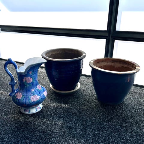 En blå kanna från Paradisverkstan, Öland, Sverige. Kannan har ett mönster av vita blad och blommor. En lykta, två andra vaser och två skålar.
