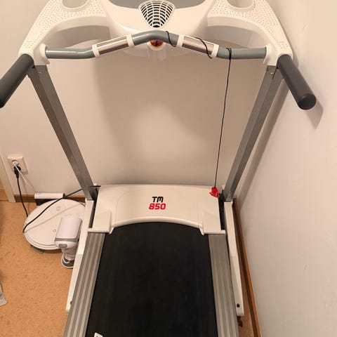 Gymstick Fun Run löpband i svart med röda detaljer. Kompakt modell med hopfällbar konstruktion som passar för användning inomhus i hemmet. Utrustad med löpyta för gång och lättare löpning samt handtag framtill för stöd under träning. (10km/h) Används två gånger bara!