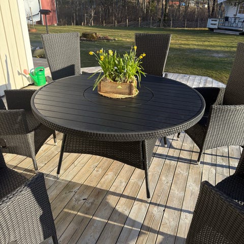 Utemöbler matgrupp i grå konstrotting. Gruppen består av ett rektangulärt matbord med bordsskiva i mörk färg samt flera stolar med höga ryggstöd i matchande grå konstrotting. Till gruppen hör även en större dynbox/förvaringslåda i samma grå konstrotting, anpassad för förvaring av exempelvis dynor eller andra trädgårdstillbehör. Passar för användning på altan, veranda eller uteplats.